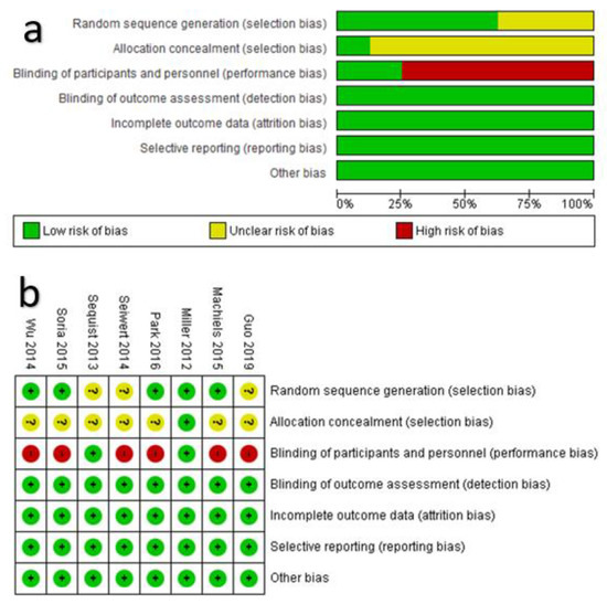 The appraisal of the risk of bias was performed at the level of studies. Across the included RCTs (n = 8), the blinding of participants and personnel was not adequately addressed, which showed a high risk of bias during the performance. In addition, the allocation concealment was unclear in most of the included studies, while the risks of detection, reporting, attrition, and other sources of bias were low (Figure 2b). Within each study (Figure 2b), six studies out of eight showed a high risk of performance bias due to that the follow-up was open label. Otherwise, the overall reviewer’s judgment showed that risks of bias in selection, detection, attrition, reporting, and other sources of bias in each RCT were low.