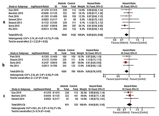 In all RCTs, OS evidence from RCT by Miller et al. [22] was excluded after application of the sensitivity test across the eight RCTs. Therefore, the meta-analysis enrolled seven RCTs [23,24,25,26,30,31,32]. The results showed that the overall pooled effect size of OS in the afatinib arm was significantly improved versus controls [HR: 0.89 (95% CI: 0.81–0.98) at p = 0.02], and the heterogeneity was non-significantly different (I2 = 0% at p = 0.71) (Figure 4a).