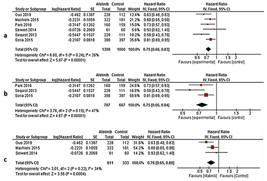 A meta-analysis of the PFS evidence from NSCLC-RCTs was intended to enroll five RCTs, however, two RCTs were excluded [22,24] after application of sensitivity test across the enrolled RCTs. Therefore, three RCTs [23,25,26] were enrolled in the meta-analysis. Hence, the results showed that the overall pooled effect size of PFS in the afatinib arm was significantly improved versus controls [HR: 0.75 (95% CI: 0.66–0.84) at p < 0.00001], and heterogeneity was non-significantly different (I2 = 47% at p = 0.15) (Figure 5b).