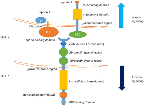 The structure of Eph receptors and their ligands is shown. Eph receptors are consisting of an extracellular structure consisting of an ephrin binding domain connected to two fibronectin type-III repeats by a cysteine-rich EGF-like motif. The juxtamembrane region connects the extracellular portion of the receptor to the intracellular kinase domain that is linked to a sterile alpha motif (SAM) domain and PDZ-binding motif. Eph ligands (ephrin-A/B) are composed of a GPI-anchored receptor binding domain in the case of the ephrin-A type and a receptor-binding domain connected by a juxtamembrane domain to a cytoplasmic domain and a PDZ interaction motif, in the case of ephrin-B. Eph-Ephrin signaling is transduced either directly (in the case of ephrin-Bs) or by interaction with Fyn (as has been observed with ephrin-As). Ligand binding likely initiates clustering, aided by receptor-receptor interactions mediated by the SAM domain and by the PDZ (Post-synaptic density protein-95, Drosophila disc large tumor suppressor (Dlg), Zona occludens-1)-domain-binding motif. The formed complexes mediate bi-directional signaling called ephrin “reverse” and Eph “forward” signaling.