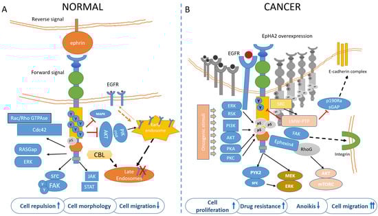 EphA2 signaling in normal (A) and cancer (B) cells. (A) In untransformed cells, EphA2 is engaged by its ligands, mainly EphrinA1 and highly tyrosine-phosphorylated. This mediates cell adhesion/repulsion through activation of Rac/Rho GTPAses and RASGap. Ligand binding also mediates inhibition of MAPK and AKT. Upon ligand binding, the EphA2 is targeted to endosomes in a CBL-mediated process. (B) In cancer cells, unliganded and overexpressed EphA2 is mainly phosphorylated in ser897 by PI3k/AKT, ERK/RSK, PKA, and PKC, in response to oncogenic stimuli The Akt-mTORC1, Raf-MEK-ERK, and Pyk2-Src-ERK signaling pathways were identified as the downstream signaling of the EphA2 non-canonical pathway. S897-phosphorylated EphA2 recruits Ephexin4 that in turn acts on RhoG to promote cell migration and anoikis resistance (this latter effect through a RhoG-AKT pathway). Further, FAK-integrin mediates cell adhesion and migration and may promote CSC features, including drug resistance (please also see Figure 3). The phospho-tyrosine content of EphA2 is also reduced by the LMW-PTPase, frequently overexpressed in cancer. The pro-tumorigenic contribution of EphA2 may thus derive from ligand independency, overexpression, reduced phospho-tyrosine content, and increased serine/threonine phosphorylation. Additionally, ligand-stimulated EphA2 negatively modulates the recycling of EGFR, by inhibiting AKT/PIKfyve, thus reducing the amount of available EGFR on the plasma membrane and migration. On the other hand, such feedback is attenuated in transformed cells, where EGFR levels in the plasma membrane are increased and this correlates with ligand independency of EphA2 and activation of motile responses to EGF.