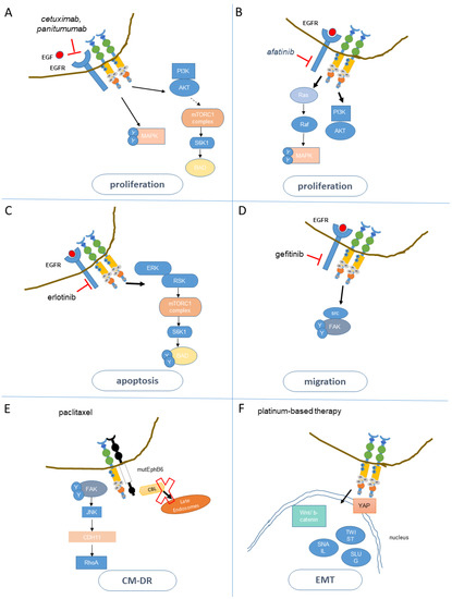 The development of anti-EGFR agents has changed significantly the prognosis of patients affected by EGFR-dependent solid tumors, including NSCLC and CRC patients. These agents currently include both monoclonal antibodies which block ligand-induced acti-vation of EGFR (cetuximab, panitumumab) and EGFR tyrosine kinase inhibitors (TKI) (for a review, [156]). In detail: cetuximab and panitumumab induce EGFR internalization and degradation after binding to the external domain of EGFR [157,158]. Quickly arising re-sistance is the major challenge affecting the efficacy of these anti-EGFR mAbs [156]. Ras mutations interfering with the Ras GTPase activity, which increase activation of PI3K/AKT and MAPK downstream pathways in an EGFR-independent way, are among the main determinants of this resistance. Notably, a low proportion of cancer cells with mutated Ras is sufficient to confer a collectively resistant phenotype in tumors under ce-tuximab or panitumumab treatment [159]. It is estimated that 40% of CRC patients bear K-Ras mutations and are non-responsive to cetuximab [160,161]. Additionally, 25% more of patients respond poorly to anti-EGFR agents, partially because of additional mutations in BRAF, NRAS and PIK3CA [162]. Last but not least, about 30% of patients with no ap-parent mutations in the mentioned genes, relapse under therapy with anti-EGFR agents. There is need to identify additional determinants of cetuximab resistance.