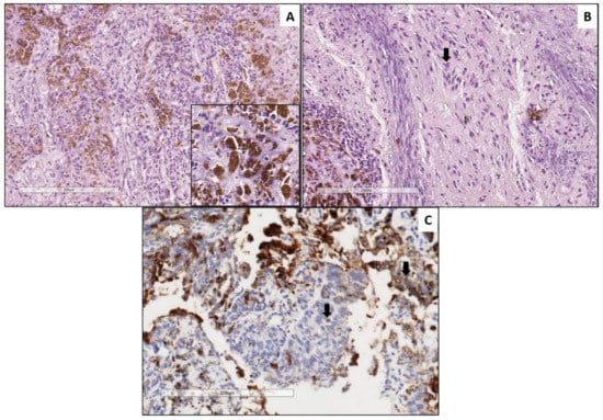 Medulloblastomas are currently divided into four histologically distinct entities (classic, desmoplastic/nodular, extensive nodularity, and large cell/anaplastic) and four genetically defined subgroups (WNT-activated, SHH- activated TP53-wildtype, SHH-activated TP53-mutant, and non-WNT/non-SHH) []. Non-WNT/non-SHH medulloblastomas are consistently separated into group 3 (MB G3) and 4 by clustering large methylation array datasets. MB G3 are mainly known for their aggressive clinical behavior, with the worst and shortest survival among infants []. Notably, medulloblastoma with melanotic differentiation is an unusual tumor whose cell of origin is still debated (despite being considered a variant of medulloblastoma). Interestingly, a neural crest origin has been proposed based on the ultrastructure and proteomic features of its pigment resembling oculocutaneous melanin, including premelanosomes (rather than neuromelanin) []. Recently, Rajeshwari et al. reported a WNT-activated medulloblastoma with melanotic differentiation and speculated about the potential contribution of neural crest cell progenitors into their pathobiology [].