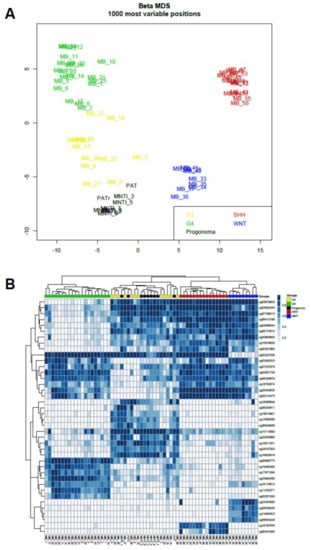 Multidimensional scaling (MS) analysis performed on the 1000 most variable probes of the whole-genome DNA methylation data shows a close similarity between (MNTI/PAT) and MBG3. Color legend of the MDS plot as follows: Progonoma (MNTI/PAT, black); WNT, Wingless MB (blue); SHH Sonic Hedgehog (red); G3, Group 3 MB (yellow); G4, Group 4 MB (green) (A). Hierarchical clustering and heatmap of beta values relative to the 39 high-quality CpG islands better discriminating MB subgroup in the Hovestadt set (Hovestadt et al.). The heatmap shows normalized methylation levels in MNTI/PAT samples and MB samples. Clusters were obtained by means of Ward’s minimum variance method using the Euclidean distance. Color legend: Progonoma (MNTI/PAT, black); WNT, Wingless MB (blue); SHH-A, Sonic Hedgehog MB (red); G3, Group 3 MB (yellow); G4, Group 4 MB (green) (B).