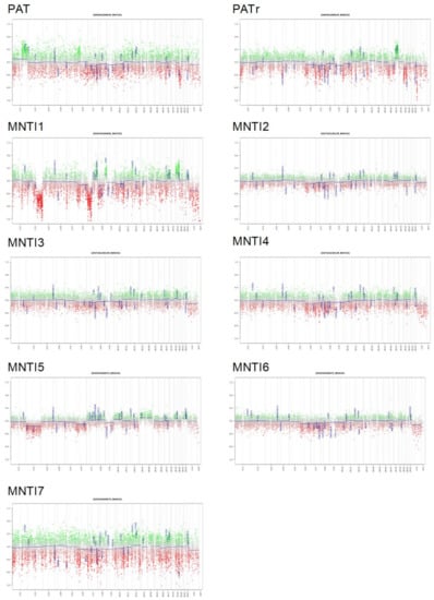 Copy number variation (CNV) profile analysis of the indicated PAT/MNTI. Depiction of structural rearrangements involving autosomes and X/Y chromosome. Gains/amplifications represent positive (green) and losses represent negative (red) deviations from the baseline. Twenty-nine tumor relevant genomic regions are highlighted.