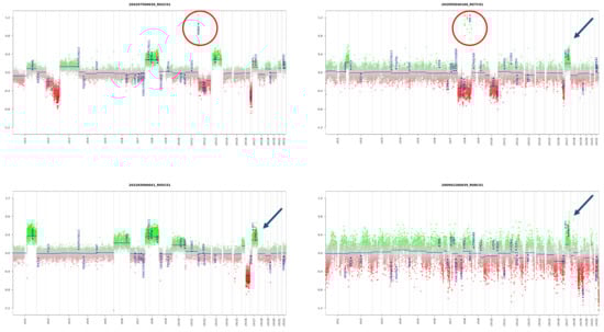 CNV of four different MBG3, subtype II analyzed at Ospedale Pediatrico Bambino Gesù. The CNV analysis shows recurrent gene and chromosomal alterations (e.g., MYC amplification [red circles] and Chr 17q gain (blue arrows)).