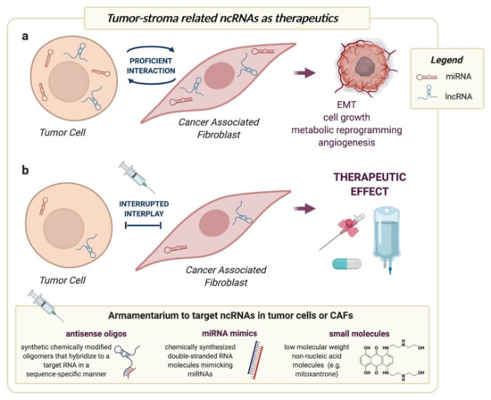 ncRNAs shown to play a role in either fibroblast activation or in CAF-induced changes in recipient cancer cells may be regarded as possible therapeutic targets or tools to interrupt tumor-stroma interplay. (a) The proficient interaction between tumor cells and CAFs sustains malignant features, such as EMT, cell growth, metabolic reprogramming and angiogenesis, through changes in the repertoire of both miRNAs and lncRNAs; (b) Strategies to overexpress or inhibit ncRNAs, including antisense oligonucleotides, miRNA mimics or small molecules, can be used to interrupt tumor-stroma interplay to obtain therapeutic benefits in terms of direct anticancer effect or enhanced response to conventional treatments. Created with BioRender.com.