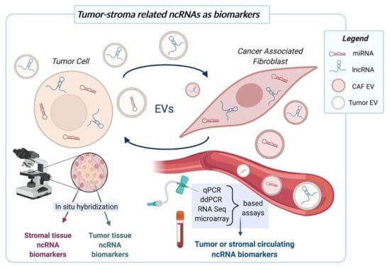 As outlined in the review, CAFs and tumor cells often communicate through the horizontal transfer of EVs, which were shown to contain both miRNAs and lncRNAs. Such vesicles deliver ncRNAs not only locally but, once released into the bloodstream, can also influence tumor progression at distant sites (Figure 2). From the biomarker point of view, the possibility to catch tumor-stroma related signals in circulation has tremendous impacts. First of all, liquid biopsy is the best source of biomarkers for its non-invasive nature and applicability to monitoring scenarios, such as tracking of tumor progression or treatment response. Liquid biopsies also make it possible to get information from different tumor foci simultaneously (even from occult tumors) and on the host systemic response to cancer. In this context, high levels of plasma exosomal miR-196a were shown to be correlated with poor overall survival and chemoresistance in head and neck cancer patients [85]. Similarly, microvesicles from patients with hormone-treatment resistant metastatic breast cancer expressed high levels of miR-221 [88], thus making this miRNA a possible predictive or monitoring biomarker. High levels of plasma exosomal lncRNA POU3F3 correlated significantly with lack of complete response to cisplatin and poor survival in esophageal squamous cell carcinoma patients [94].