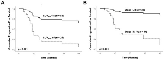 Progression-free survival curves of study subjects sub stratified according to standardized uptake values Average (SUVavg) (A) and Masaoka stage (B): SUVavg classified into high/low with 5.0 as a cut-off and Masaoka stage classified into I, II and III, IV.
