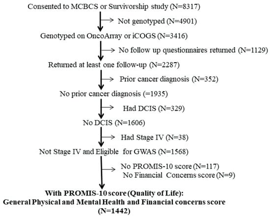 Genotype and follow-up questionnaire data from the Mayo Clinic Breast Disease Registry (MCBDR) provide the analytic basis for this study. The MCBDR is an ongoing clinic-based longitudinal cohort that enrolls patients with breast cancer diagnosed within the year prior and seen at least once at the Mayo Clinic in Rochester, MN. More than 8000 patients had consented to participate in MCBDR between 2003 and 8 July 2020, the date of database freeze for this study, with accrual rates currently approximating 600/year (70–80% of those approached). Consenting participants complete questionnaires at baseline and during follow-up (by mail) and allow intermittent reviews of their medical records and access to tumor tissue when available. For the current study, patients with other prior cancers, DCIS/stage 0 diagnosis, or stage 4/metastatic breast cancer were excluded. All PROMIS-10 data following a cancer recurrence were also excluded. Otherwise eligible patients, who returned at least one pre-recurrence follow-up questionnaire that included the PROMIS-10, and for whom genotyping had been performed, were included in the analyses (Figure 1). All MCBDR participants signed an IRB-approved, informed consent in accordance with federal and institutional guidelines.