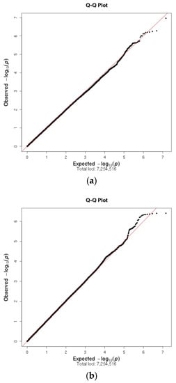 - Pruim, R.J.; Welch, R.P.; Sanna, S.; Teslovich, T.M.; Chines, P.S.; Gliedt, T.P.; Boehnke, M.; Abecasis, G.R.; Willer, C.J. LocusZoom: Regional visualization of genome-wide association scan results. Bioinformatics 2010, 26, 2336–2337. [Google Scholar] [CrossRef] [PubMed]