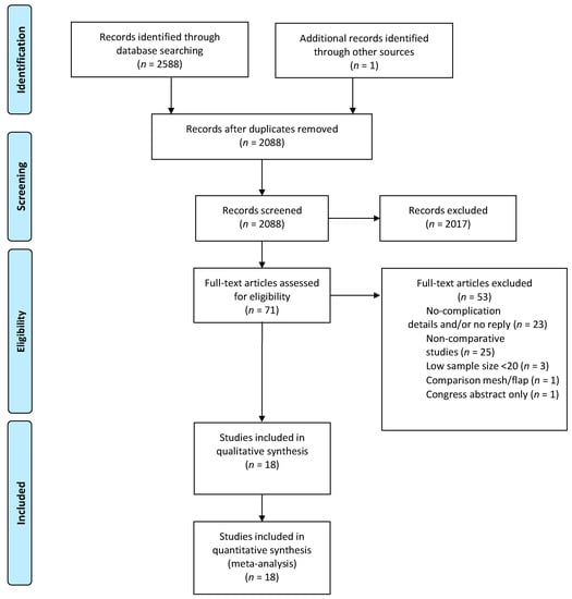 The initial search resulted in 2588 citations, and one citation was added with a manual cross-reference. Then, 2088 titles remained after removing duplicates. After screening, 71 publications were retrieved for full-text review. When data was not available, the corresponding authors were contacted: four of them answered [18,19,20,21], and two of them could provide data details [18,21]. From the 71 articles, 53 articles were excluded, and the reasons are detailed in Figure 1. Finally, eighteen articles were included in quantitative synthesis (Figure 1) [6,7,9,10,18,21,22,23,24,25,26,27,28,29,30,31,32,33].