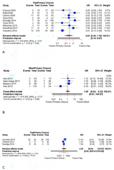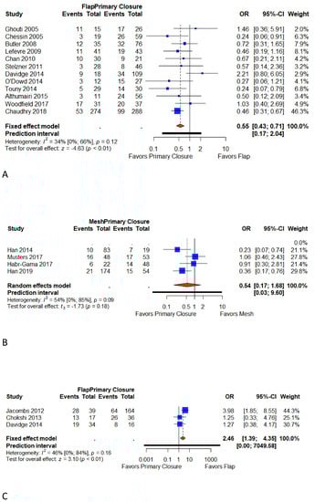 Forest plot for minor perineal wound complications between patients with primary closure and with flap closure (A); forest plot for minor perineal wound complications between patients with primary closure and with mesh closure (B); forest plot for minor perineal wound complications between patients with primary closure and with flap closure in pelvic exenteration (C). Odds ratio: overall ratio of minor perineal wound complications when comparing primary closure with flap closure. All weights are from random effects analysis. M–H, Mantel–Haenszel.