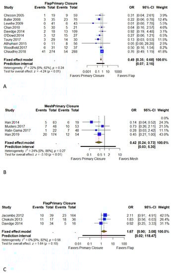 Forest plot for total perineal wound complications between patients with primary closure and with flap closure (A); forest plot for total perineal wound complications between patients with primary closure and with mesh closure (B); forest plot for total perineal wound complications between patients with primary closure and with flap closure in pelvic exenteration (C). Odds ratio: overall ratio of total perineal wound complications when comparing primary closure with flap closure. All weights are from random effects analysis. M–H, Mantel–Haenszel.