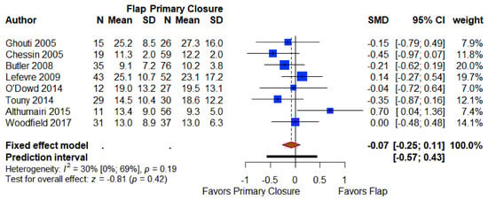 Eight articles providing data for the postoperative length of stay in Group A were included in our meta-analysis [6,7,21,22,26,27,28,29]. The pooled weighted mean length of stay was 15.1 days (95% CI 13.2, 16.9) for primary closure, and 17.4 (95% CI 13.5, 21.2) days for flap closure, which was not significantly different (SMD −0.07 CI 95% −0.25–0.11) (Figure 5).