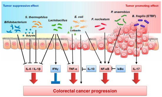 Thus, IL-10 can modulate the development of CRC, and this process can be influenced by the gut microbiota. However, the exact effects on tumor progression, whether tumor-promoting or -suppressive, should be further investigated owing to the dual role of IL-10 in cancer development.