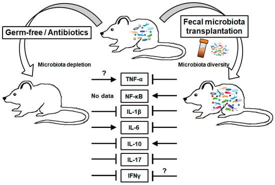 These roles of IL-10 can be influenced via the manipulation of the gut microbiota. Burrello et al. reported that IL-10 expression in colonic lysates and IL-10 secretion from colonic CD4+ T cells were enhanced in FMT-treated mice [27]. Mishima et al. also confirmed that IL-10 secretion and Il10 mRNA expression in colon tissue were significantly lower in GF mice than in control mice; they showed that these were recovered upon FMT. FMT in GF mice increased IL-10-producing T cells (CD25− CD4+ CD3+) and B cells (B220+ CD19+), which were characterized from colon LP cells. The colonic mRNA expression of Ifng was also increased by FMT in GF mice. However, this effect was inhibited in Il10−/− mice, suggesting that FMT-induced cytokine modulation is associated with IL-10 [94].