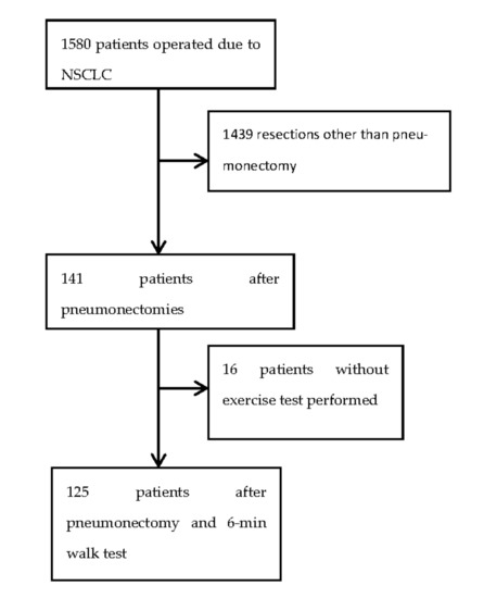 A total of 1580 patients were operated in the single center due to NSCLC between January 2009 and January 2018. A homogenous group of 125 patients who performed a 6MWT one day before undergoing pneumectomy, were included in this retrospective study. The detailed study accrual is described in Figure 1. Sixteen patients who did not undergo 6MWT due to different reasons (mainly difficulty moving) were characterized in Table 1. The prospectively collected data from the Polish National Lung Cancer prospective database (Krajowa Baza Raka Pluca-KBRP) were matched with 6MWTs routinely performed in the department.