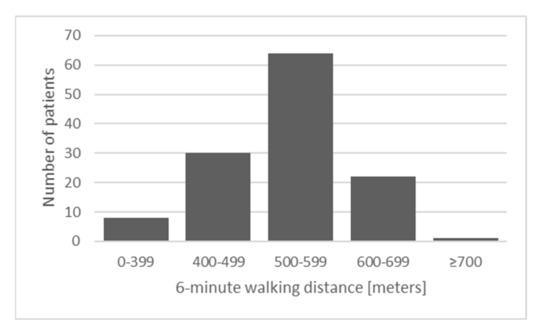 The histogram presenting the distribution of distance covered during 6MWT is presented in Figure 2.