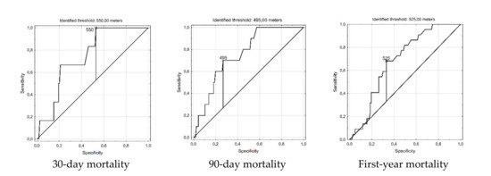 The ROC curves method enabled evaluation of exact cut-off values of 6MWT discriminating the patients with different early and mid-term mortalities. The method identified that maximal sensitivity and best specificity was obtained for 550 m (30-day mortality; AUC 0.743, 95% CI 0.592–0.894), 495 m (90-day mortality; AUC 0.753, 95% CI 0.627–0.88) and 525 m (First-year mortality AUC 0.684; 95% CI 0.581–0.788), presented in Figure 3.
