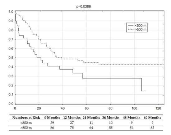 The patients who covered shorter distance had poorer short-term and long-term overall survival. This is consistent with other studies proving that 6MWT is an adequate prognosticator of postoperative complications, early, mid-term mortality and long-term survival [8,9,10,12,13,14]. The above-mentioned studies propose different thresholds differentiating populations with different risks. The previously published thresholds identifying higher risk of postoperative complications are: 300 m [10], 400 m [14], 500 m [9]. Our study identified 500 m as an adequate result of the 6MWT identifying patients with increased risk of cardiovascular complications (OR 2.537, 95% CI 1.100–5.849) in patients with early NSCLC undergoing pneumonectomy. Performing the test on a treadmill, not according to ATS criteria, does not seem to have an impact on the clinical value of 6MWT [14]. Treadmill 6MWT shows similar threshold values differentiating patients with different risks of cardiopulmonary complications after lobectomy due to lung cancer [14]. Most of the cited studies analyze data of patients who underwent lobectomy. This homogenous population enables acquisition of prompt results. However, pneumonectomy patients deserve even more detailed analysis due to less predictable pattern of eventual complications and early mortality [15]. The assessment of the risk of complications goes beyond the evaluation of pulmonary function tests. In this group of patients synergistic tests, e.g., the cardio-pulmonary exercise test, shuttle walk test or stair climb test, are included in the guidelines and treatment algorithms [6,7].