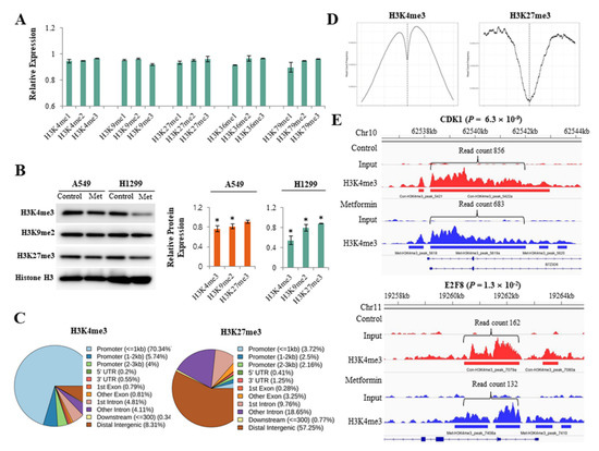 Effects of metformin on histone H3 modifications. H1299 and A549 cells were treated with 5 mM metformin or left untreated as controls. (A) Global alterations in histone H3 methylations were analyzed using an enzyme-linked immunosorbent assay. The y-axis indicates the amounts of proteins in metformin-treated cells relative to untreated cells. Error bars indicate the standard deviation (n = 3). (B) Protein levels of H3K4me3, H3K9me2, and H3K27me3 were analyzed by western blotting. The bar graphs show the expression of three proteins in cells treated with 5 mM metformin relative to untreated cells. Error bars indicate the standard deviation (n = 3, * p < 0.05). The uncropped blots of (B) were shown in Figure S1. (C) The results from the ChIP-seq analysis show DNA regions in which H3K4me3 or H3K27me3 modification were enriched in response to metformin. (D) The read count frequency of H3K4me3 or H3K27me3 within the transcription start site (TSS) ± 3 kb is shown. (E) The images show ChIP-seq peaks of two representative genes whose H3K4m3 was reduced by metformin. Peaks indicate read count frequency.