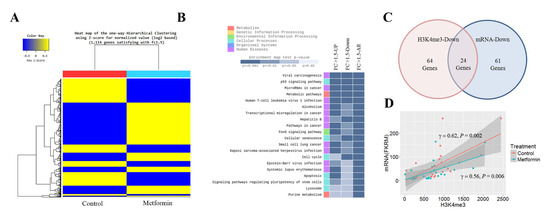 Effects of metformin on mRNA expression. The mRNA levels in H1299 cells treated with 5 mM metformin or left untreated as controls were analyzed by RNA-seq. (A) Heatmap shows one-way hierarchical clustering to stratify differentially expressed genes in treated and untreated cells. (B) Genes significantly up- or downregulated in response to metformin were identified using the cutoff value |FC| ≥ 1.5. The top 20 KEGG (Kyoto Encyclopedia of Genes and Genomes) pathway terms for genes with more than a 1.5-fold change in their mRNA levels are shown. (C) The number of cell cycle genes with reduced H3K4me3 at the promoter regions or downregulated mRNA in cells treated with metformin is shown. (D) The correlation between H3K4me3 and mRNA levels was analyzed for twenty-four genes with reduced H3K4me3 and mRNA.
