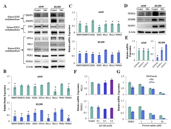 Effects of metformin on the expression of histone H3 methyltransferase and demethylase. H1299 and A549 cells were treated with 5mM metformin or left untreated as controls. (A) Protein levels of the H3K4 methyltransferases SET1A, MLL1, MLL2, WDR5, and WDR82; the H3K9 methyltransferases EHMT1 and EHMT2; and the H3K27 methyltransferases EZH1 and EZH2 were analyzed using western blotting. The uncropped blots of (A) were shown in Figure S2. (B) The expression levels of the methyltransferases in metformin-treated cells relative to control cells are shown. (C) mRNA levels of the methyltransferases were measured by qRT-PCR. The y-axis indicates the fold change in mRNA levels in metformin-treated cells compared with those in untreated control cells. (D) The protein levels of the H3K4 demethylase KDM5A and the H3K9 demethylases KDM4B and KDM7C were analyzed using western blotting. The expression levels of the demethylases in metformin-treated cells relative to control cells were shown in Figure S3A, and the uncropped blots of (D) were shown in Figure S3B. (E) The mRNA levels of three demethylases in metformin-treated cells relative to those in untreated cells. (F,G) H1299 cells were incubated with the AMPK activator AICAR or the AMPK inhibitor dorsomorphin (Dorso) with or without 5 mM metformin. The mRNA levels of MLL2 and WDR82 were measured by qRT-PCR. The error bars in all bar graphs indicate the standard deviation (n = 3, * p < 0.05).