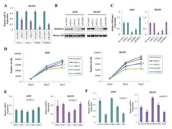 To find the H3K4 methyltransferase that was most significantly involved in the reduction of H3K4me3 in cells treated with metformin, we performed gene knockdown experiment on the H3K4 methyltransferases MLL1, MLL2, WD repeat domain 5 (WDR5), and WDR82 using respective siRNA. The knockdown efficiencies were confirmed by real-time PCR analysis (Figure 4A). Knockdown of MLL2 most significantly reduced global level of H3K4me3 (Figure 4B,C) and inhibited cell proliferation (Figure 4D) in both A549 and H1299 cells. The number of cells on the third day after siMLL2 transfection has decreased to 66% and 51% comparing with the siControl condition in A549 and H1299 cells, respectively (Figure 4D). MLL2 knockdown downregulated expression of the positive cell cycle regulators showed significant H3K4me3 reduction at their promoters in response to metformin (Figure 4E). Expressions of some other important cell cycle regulators such as cyclin B1 (CCNB1), cyclin E1 (CCNE1), and E2F1 were also dowregulated in siMLL2 cells (Figure 4F).