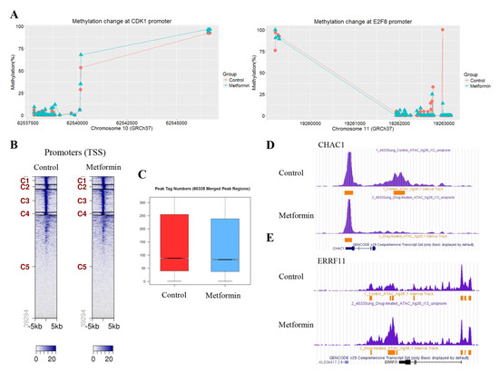 To understand whether the observed changes in the mRNA levels of cell cycle regulatory genes in response to metformin are associated with DNA methylation, we analyzed the methylation levels of CpGs at the promoter regions of the genes using the SureSelect Methyl-Seq Target Enrichment System. Some regions at the genome level were found to be hyper- or hypomethylated, but most of the cell cycle regulatory genes did not show significantly altered DNA methylation like that seen in CDK1 and E2F8 (Figure 5A). ATAC-seq was performed to investigate whether the downregulation of positive cell cycle regulators in cells treated with metformin was associated with changes in chromatin accessibility. The ATAC-seq data are available at the GEO with ID: GSE141059. Chromatin accessibility in cells treated with metformin decreased in 159 regions and increased in 124 regions. Most regions with changes in chromatin accessibility were outside of promoter regions defined as TSS ± 3kb. Tag distribution (Figure 5B) in the promoter regions and the peak tag number in the total merged peak (Figure 5C) were found to be similar. The regions showing the greatest increase and decrease in chromatin accessibility were located 4667bp downstream of ChaC glutathione specific gamma-glutamylcyclotransferase 1 (CHAC1) (Figure 5D) and 15,111 bp downstream of ERBB receptor feedback inhibitor 1 (ERRFI1) (Figure 5E), respectively. We identified 54 genes whose chromatin accessibility was significantly changed at the promoter regions, but most of those genes were not related to cell cycle regulation (Table S8). We further analyzed the chromatin accessibility at the promoter regions of the approximately 2500 genes where the H3K4me3 level was significantly altered by metformin. The average change (log2Ratio) of chromatin accessibility in the 1113 genes showing H3K4me3 downregulation by metformin was a little greater than the change in the 1492 gens showing H3K4me3 upregulation (−0.11 vs. −0.07), but the difference was not statistically significant (p = 0.09; Student’s t-test). Based on these observations, it is reasonable to speculate that H3K4me3 alterations by metformin at promoter regions may not be associated with chromatin accessibility.