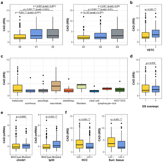 Comparison of CAD expression with clinicopathological and molecular parameters. (a) Quantification of CAD expression detected by immunohistochemistry with respect to vascular invasion (left panel, V0: n = 344, V1: n = 109, V2: n = 80) and tumor grade (right panel, G1: n = 99, G2: n = 265, G3: n = 115). (b) Quantification of CAD expression in relation to absence or presence of the VETC pattern (VETC-: n = 438, VETC+: n = 95). (c) Quantification of CAD expression according to morphological tumor subtype (patient numbers: trabecular: 418, scirrhous: 5, pseudogl.: 18, macrotrab.: 41, steatohep.: 22, fibrolam.: 3, clear cell: 7, lymphocyte-rich: 3, HCC-CCC: 8). (d) CAD expression levels in relation to absence or presence of GS overexpression as a marker for CTNNB1 mutations/activated WNT-signaling (GS neg.: n = 423, pos.: n = 109). (e) Quantification of CAD mRNA in the TCGA cohort with respect to mutational status of CTNNB1 (left panel, wild type: n = 264, mutated: n = 96) and TP53 (right panel, wildtype: n = 249, mutated 111). (f) Quantification of CAD expression in tumor tissue (left panel, no cirrhosis: n = 192, cirrhosis: n = 341) and in the surrounding liver tissue (right panel, no cirrhosis: n = 188, cirrhosis: n = 342) with respect to absence or presence of liver cirrhosis. For all analyses * denotes p ≤ 0.05, *** p ≤ 0.001.