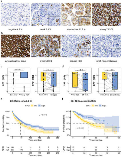 To further analyze UC dysregulation and pyrimidine synthesis in HCC, the key enzyme catalyzing the initial and rate-limiting step of the UC, CPS1, was investigated. Reduced expression of CPS1 may favor glutamine usage by CAD providing substrates for de novo pyrimidine synthesis and thus favoring proliferation [15]. To test whether CPS1 is of clinical and prognostic relevance, we used the well-established hepatocyte paraffin antigen 1 antibody, which has previously been demonstrated to recognize CPS1 [12], and detected CPS1 by immunoblotting at the predicted molecular weight of 165 kD (Figure S1a). In cultured Huh7 und HepG2 cells, we did not detect CPS1 expression, neither by immunoblot nor immunocytochemistry (Figures S1a,c and S5). CPS1 was not immunohistochemically detectable in 4.9% of the HCCs (IRS = 0), whereas 9.9% displayed weak (IRS = 1–4), 11.9% intermediate (IRS = 5–8), and 73.3% strong (IRS = 9–12) CPS1 immunoreactivity (Figure 3a). CPS1 was downregulated in HCC tissue when compared to the surrounding non-neoplastic liver tissue (Figure 3b,c, left panel), and was further downregulated in recurrent HCCs and distant HCC metastases (Figure 3b–d), while lymph node metastases displayed a trend towards lower CPS1 expression (Figure 3b,d). When we restricted expression analysis to early, most probably true recurrences (<2 years, see above), CPS1 expression was significantly reduced when compared to the primary HCC as well (Figure S2b). Low CPS1 protein expression (IRS ≤ 8.75) in primary HCCs predicted decreased overall survival (Figure 3e). This finding was also confirmed on the mRNA expression level in the TCGA cohort of HCC patients (Figure 3f).