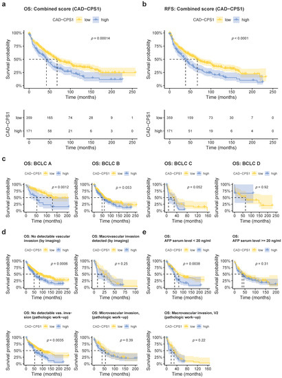 Combining the immunoreactive scores of CAD and CPS1 improves prognostic prediction and is particularly predictive in early stage HCC without vascular invasion. (a) Kaplan–Meyer plot showing overall survival rates in patients with respect to a high or low combined CAD-CPS1 score. (b) Kaplan–Meyer plot showing recurrence-free survival rates in patients with respect to a high or low combined CAD-CPS1 score. (c) Analysis of overall survival in relation to BCLC stage (BCLC A, low: n = 76, high = 21; BCLC B, low: n = 216, high n = 122; BCLC C, low: n = 36, high n = 25, BCLC D, low: n = 31, high: n = 3). (d) Analysis of overall survival in relation to macrovascular invasion detected by preoperative imaging (upper two panels, no vascular invasion, low: n = 322, high: n = 144; with vascular invasion, low: n = 37, high: n = 27) and micro- and macrovascular invasion detected during pathologic work-up (lower three panels, V0, low = 259, high: n = 83; V1, low = 53, high = 56; V2, low: n = 47, high: n = 32). (e) Overall survival in relation to AFP serum level (AFP < 20 ng/mL, low: n = 198, high: n = 49; AFP ≥ 20 ng/mL, low: n = 93, high: n = 84).