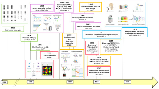 Figure 1. The history of AML genomic discoveries. Green, purple, red, orange and blue represent respectively cytogenetic, Sanger sequencing, CGH array, NGS and Single Cell Sequencing technological discoveries. CGH: Comparative Genomic Hybridization; NGS: Next Generation Sequencing; AML: Acute Myeloid Leukemia.