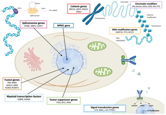 Fusion genes are responsible for a blockage of differentiation. Mutations of in myeloid transcription factors are implied in cell proliferation, whereas genetic alterations of tumor suppressor genes induce blockage of apoptosis. Abnormalities in spliceosome genes cause synthesis of new pre-mRNAs, implied in leukemogenesis. Mutations in NPM1 gene are responsible for the synthesis of an abnormal nucleolar chaperon protein, which causes dysfunctions on ribosomal synthesis and cellular proliferation. Genetic alterations in cohesin genes lead to asymmetric division of chromosomes during mitosis. Mutations of chromatin modifiers or DNA modification genes are responsible for abnormal up and down regulation of genes implied in AML leukemogenesis.