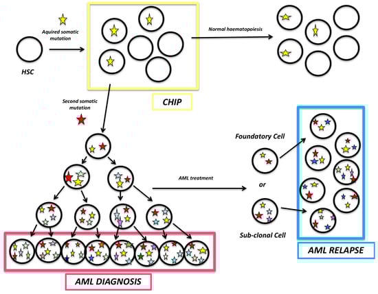 Schematic representation of the different stages of AML. Each star represents a new acquired somatic mutation. The first step is the occurrence of an acquired somatic mutation in an HSC leading to a clonal proliferation, a pr-leukemic state named CHIP. This preleukemic state can either never evolve or lead to an AML with second acquired mutation. During AML evolution, initial cells acquire additional mutations leading to a subclonal disease. After AML treatment, in some cases relapse is observed. It occurs from a founding cell or a subclonal cell.