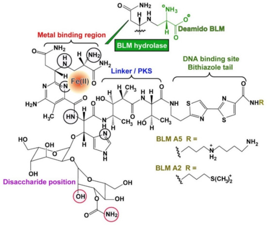 Metal (Fe(II))-BLM complex. Structure modified according to [8,9]. The modular built BLM molecule comprises the DNA binding site, the linker region synthesized by polyketide synthase, the metal binding region with its interacting nitrogen atoms (black circles) and the disaccharide portion (the red circles interact with the minor groove of the DNA). Fe(II) is the most active central transition metal ion. The BLM species A5 and A2 are present in the clinically used formulation. The reaction of the BLM hydrolase which catalyzes the reaction to the less toxic deamido BLM is outlined.