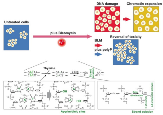 (Above) Survey about the target of the manuscript. BLM is added to untreated A549 cells. During the incubation with the drug the cells undergo DNA damage followed by chromatin expansion. This effect can be (at least partially) blocked by polyP. (Below) During the incubation with BLM the integrity of DNA is broken. After activation of BLM by O2 thymine bases are released from the DNA, especially at sites adjacent to a purine. At those sites, apyrimidinic sites, β-elimination occurs that results in the formation of α, β-unsaturated aldehyde and 5′-phosphate DNA strand termini (according to [21]).