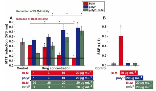 It was the aim of the present study to elucidate if the physiological, morphogenetically acting polymer polyP interferes with the growth of the cells. The soluble Na-polyP was used for the study, here a concentration of also 20 µg mL−1 was applied since this concentration has earlier been detected to cause a morphogenetic effect on cells in vitro, for example to induce mineralization in osteoblast-like SaOS-2 cells [66]. This concentration of polyP (20 µg mL−1) caused a 66% increase in A549 cell growth (Figure 3A). If increasing concentrations of this polymer are co-added to BLM (at 20 µg mL−1) a gradual decrease of BLM-caused cell toxicity is measured. At the level of 1 µg mL−1 of co-addition the reduction of BLM-caused toxicity (BLM, 20 µg mL−1) comes to ~60%, a value that further increases close to a value seen in the polyP assays alone.