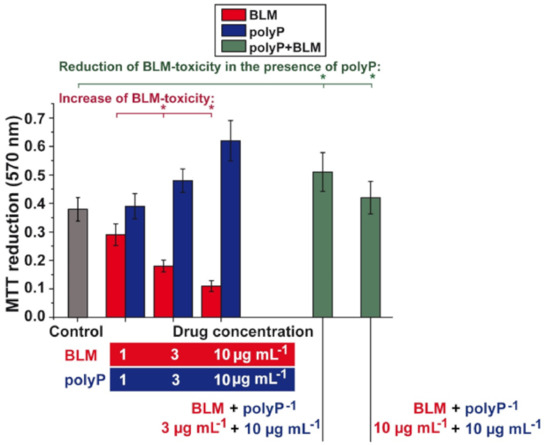 Effect of BLM and polyP on cell viability of BEAS-2B cells. While BLM is reducing the cell viability in the MTT assay (red bars), polyP is enhancing the viability (blue bars). If these two compounds are added together to the cultures, at the indicated concentrations, not only an elimination of the inhibitory activity of BLM is seen, but even an increase of viability is measured in the assays (green columns). (* p < 0.01).
