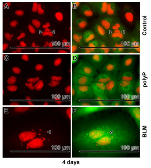 Enlargement of A549 cells after exposure to BLM; 4 days incubation period. The cells are stained with DRAQ5 for a visualization of the nuclei (left panel), or with Calcein-AM (viable cells; right panel). (A,B) In normal cultures the nuclei have a size of ~12 µm, similar to (C,D) those measured in cells treated with polyP (20 µg mL−1). Often nuclei division figures are seen (>,<). (E,F) In contrast, the volume of the cells in BLM treated cultures increases markedly; seldom fragmentation signs are seen (<).