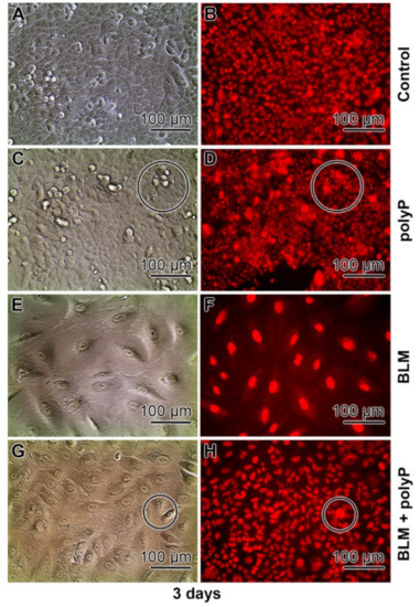Prevention of chromatin/nuclear expansion of A549 cells by polyP; 3 days incubation, and inspection by Nomarski optics (left panel) and immunofluorescence microscopy (DRAQ5). (A,B) In the controls the cells are arranged in a cobblestone pattern. (C,D) After treatment of the cells with polyP (20 µg mL−1) the cells show frequently a three dimensional organization patter (circles). (E,F) BLM treated culture (20 µg mL−1) with the large nuclei. (G,H) Co-incubation of the cells with BLM (20 µg mL−1) and polyP (20 µg mL−1). Occasionally, patches with a three-dimensional growth of the cells exist (circles).