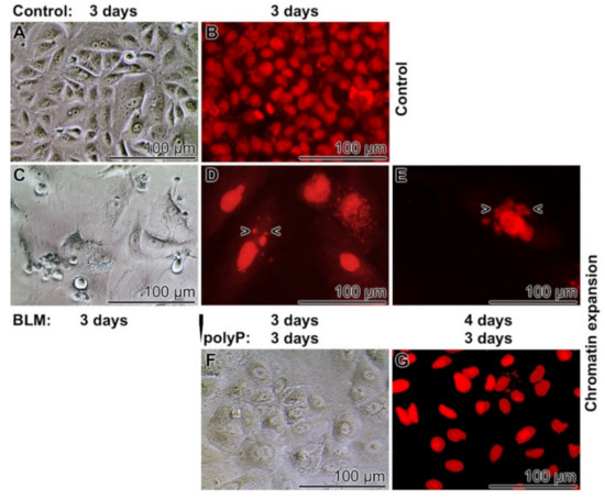 In a comparative study it was tested if the BLM (20 µg mL−1)-caused increase in cell volume is reversed by a secondary application of polyP (20 µg mL−1) to the cells (Figure 7). Again, in the controls without the two compounds the cells grow to a smooth layer after 3 days of incubation. The cells are arranged in a cobblestone pattern (Figure 7A,B). In the presence of BLM the pattern of cell arrangement becomes more irregular (Figure 6C) and the nuclei reaches sizes of ~25 to 28 µm in diameter (Figure 7D). After an extension of the incubation to 4 days some nuclear fragmentation is occasionally visible (Figure 7E). If the BLM-treated cultures (for 3 days) are transferred to a BLM-free medium/serum with polyP (20 µg mL−1) for a period of 3 days the size of the nuclei decreases slightly to 23.3 ± 8.4 µm (Figure 7F,G). Those cells remain in a viable state for at least three additional incubation days (data not shown).