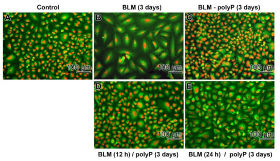 Different duration of incubation/preincubation of A549 cells with BLM (20 µg mL−1) to determine the rescue activity of polyP (20 µg mL−1); the cells are stained with DRAQ5 (staining of nuclei) together with Calcein-AM (viable cells). In the controls (A) absence of any compound, (B) effect of BLM alone, and (C) on BLM together with polyP during the 3 days incubation period the different sizes of the cells are obvious. (D) Exposure of the cells with BLM for 12 h followed, after washing, by an incubation with polyP for 3 days. (E) The preincubation period with BLM was extended to 24 h, followed by an incubation with polyP (3 days).