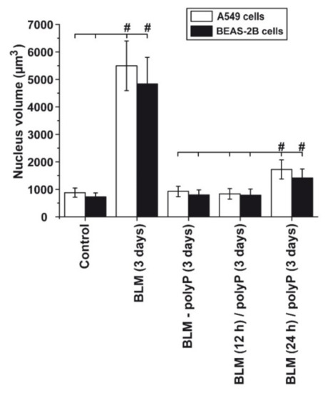 A quantitative assessment of the rescue effect of polyP was performed both with A549 cells and with BEAS-2B cells (Figure 9). The size of the nuclei in BEAS-2B cells is slightly smaller than in A549 cells. The graph shows that addition of BLM to both cells caused the drastic enlarging effect from about 800 µm3 (controls) to ~5000 µm3 (BLM-treated cultures for 3 days) during the 3 days incubation period. However, if in a pre-incubation period the drug BLM exposure was shortened to 12 h or 24 h followed by the addition of polyP (in the absence of BLM) the size of the nuclei increased only slightly to to ~800 µm3 (12 h BLM) or ~1500 µm3 (24 h BLM). These data show that the aberrant effect of BLM is much reduced during a shorter incubation period.