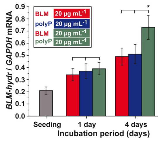 A549 cells were incubated with BLM (20 µg mL−1) or polyP (20 µg mL−1) alone or in combination and the steady-state expression of the gene encoding the BLM hydrolase was measured by qRT-PCR. The exposure of the cells to the single components does not cause a significant difference in the expression level within one group. After 1 day of incubation, an approximately 70% increase of the expression levels is seen (Figure 10). However, if the incubation period is extended to 4 days the values increased again by 40% for the cells exposed to a single component. If the two compounds (BLM and polyP) are added simultaneously to the cultures a significant increase in the BLM hydrolase expression level of 3.5-fold is measured (Figure 10).