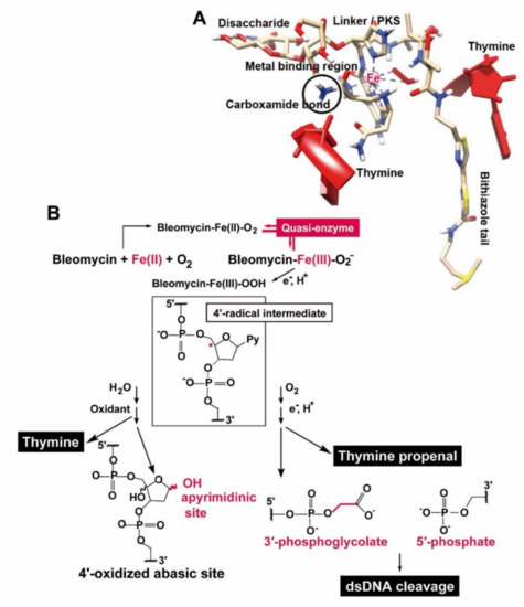 BLM is a member of a first class of DNA splitting drugs that remove preferentially thymine from double- and single-stranded DNA [11]. After the discovery that this drug is intracellularly activated by iron ions [13] a clear view on the mode of action of BLM became possible. DNA is cleaved either through the Fe(II) drug complex together with O2 in two subsequent steps, or via a Fe(III) drug complex together with H2O2 in one step. The oxidation state of Fe in BLM is reversible [15] (Figure 11). Based on this property BLM was termed a quasi-enzyme [16], suggesting a relationship to a nuclease cleaving at an apyrimidinic site within the DNA [71,72]. The BLM hydrolase is cleaving the carboxamide bond of the β-aminoalanine moiety [73] resulting in a loss of biological activity of the drug. This amide group is proposed to bind to DNA [thymine] [16]. It has been proposed that binding of BLM to DNA occurs via the hydrogen atom of the amide group in the carboxyl amide moiety, which forms a hydrogen bond with the 2-keto group of the thymine. This keto group of thymine is exposed to the narrow groove of the DNA double helix. For both single- and double-stranded DNA, and depending on the availability of O2, the DNA is attacked via a 4′-radical intermediate a process which causes the releases of thymine from the DNA und the formation of an apyrimidinic site. From there DNA damage starts and allows the 3′-phosphoglycolate and the 5′-phosphate termini to form [15,74].