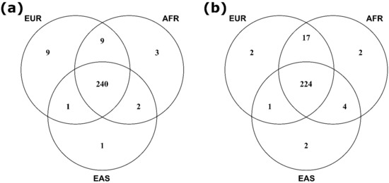 Venn diagrams comparing the proportion of the 269 independent GWAS index variants reported to date that were (a) present at ≥1% risk allele frequency, and (b) present at ≥5% risk allele frequency in European (EUR), African (AFR) and East Asian (EAS) ancestral super-populations.
