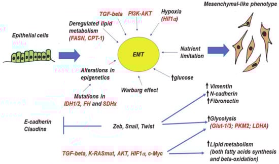 Taken together, these data suggest complex relations between EMT and metabolic alterations in cancer (Figure 3). In the recent years, it has become apparent that EMT is tightly associated with metabolic reprogramming and itself can be induced by specific changes in metabolism and nutrients levels. In a poor nutrition environment, the competition between cancer cells for resources may result in generating phenotypic heterogeneity and selecting specific genetic and phenotypic subpopulations [155]. These changes would subsequently manifest in metabolic alterations associated with EMT.