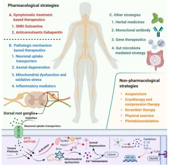 Despite the extensive research effort focused on understanding mechanisms involved in the development of CIPN, the translation of this mechanistic understanding into rationally-designed, clinical intervention studies remains problematic [7]. According to a study conducted by investigators at the National Cancer Institute, based on databases covering the period January 2011 to May 2019, only 3 of 35 clinical trials that investigated agents or devices to treat CIPN incorporated a mechanistic rationale to support the choice of the intervention. This not only speaks to the urgent need for collaborations between basic and clinical research teams but also emphasizes the thesis that a deeper understanding of the underlying mechanisms that initiate and cause the progression of CIPN will ultimately facilitate the development of effective prevention and treatment strategies [8,9,10]. In the current article, we provide an overview of emerging therapeutics for the prevention and treatment of CIPN and focus on pharmacological strategies that are derived from novel mechanistic insights and have the potential to be translated into clinically beneficial approaches (Figure 1).